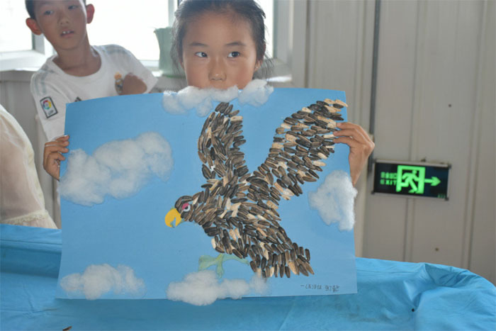 活动中,让我们看到有父母、爷爷奶奶、哥哥姐姐等与孩子们一起参与活动的高涨热情与浓厚兴趣,也看到家长和孩子们在玩中学,学中玩的快乐场面。整个活动洋溢在温馨友好的气氛中,不到一小时的时间,家长和孩子们制作出精美的手工制作品:有用瓜子壳与棉花制作的雄鹰展翅、有用折纸制作出的花和衣服、有用画笔涂出来的蓝天白云与荷塘月色,每一个作品都显现出孩子们丰富的想象力和创作力。