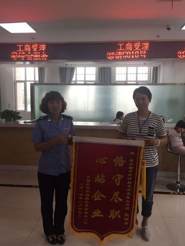 2017年8月15日上午,新疆聚恒石油技术服务有限公司将写着“恪守尽职、心贴企业”的锦旗送到了库尔勒经济技术开发区行政服务中心工商窗口工作人员手中,感谢工作人员热情周到、细致高效的服务。