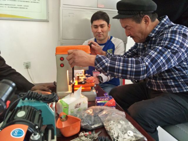 据了解,买买提·沙吾提,离异多年,由于没有文化,不好就业,自己在团结市场靠配钥匙和社区发放的低保金度日,家里生活很困难。陈书记调查走访后,了解到买买提的家庭收入来源的基本情况后,同社区领导班子深入分析他致困的原因,共同探讨为其脱贫致富的方法,提出切实可行的脱贫措施和建议,经过多次沟通商讨陈书记提出给买买提购买一台自动化的配钥匙机器和模具,帮助他加快创业致富脱贫步伐。经过社区主任依明江·吐尔逊多方实地查看对比,精心挑选,最终将这份 “特殊”礼物送到买买提手中,买买提脸上洋溢着幸福的笑容,马上打开进行操作使用,不停地说:“这个东西太好啦,有了它,以后我的生活就有指望啦!太谢谢你们啦!”